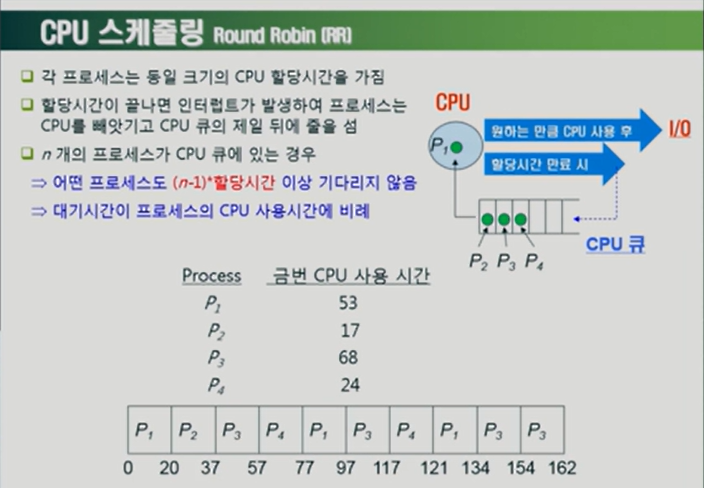 starvation 문제를 해결하고 프로그램 프로세스들에게 효율적이면서, 공정하게 자원을 사용할 기회를 부여하기 위한 방법으로서, 각 프로세스에 일정 시간을 할당하고, 할당된 시간이 지나면 인터럽트가 발생하여 프로세스는 CPU를 빼앗기고 CPU뒤에 줄을 다시 선다.