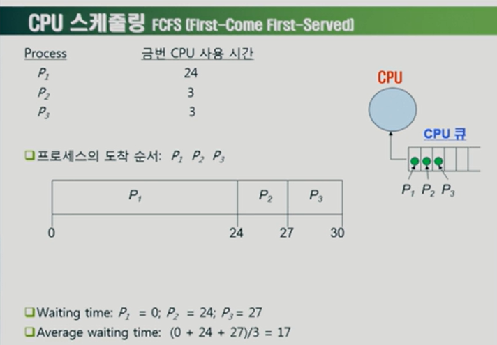 1. cpu 큐에 프로세스가 p1,p2,p3를 들어온 순서대로 스케쥴링 하는 경우
