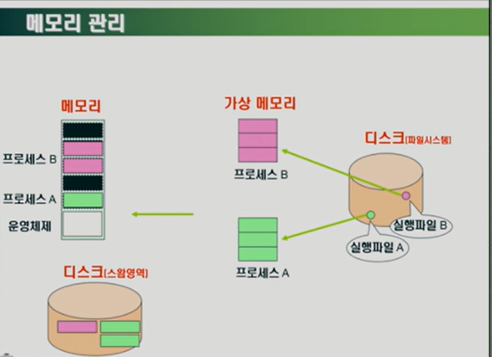 프로그램을 실행시키면 독자적인 메모리 주소가 메겨지고, 이것이 바로 물리적인 메모리에 올라가는 것이 아니고, 일단 본인만의 메모리 공간이 만들어집니다. 이것이 가상 메모리 입니다. 이 가상 메모리 중 당장 필요한 부분만 물리적인 메모리에 넣어두게 됩니다. 메모리가 가득 차, 이후 필요했던 부분이 더이상 필요하지 않게 되면 디스크의 스왑영역으로 이동시킵니다.
