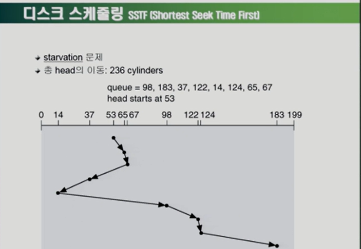 한계: 동일한 트랙이나 실린더 요청이 연속적으로 발생하면 헤드가 더 이상 나아가지 못하고 제자리에 머물게 되어 바깥쪽 트랙이 아사 현상을 겪는 문제가 발생.