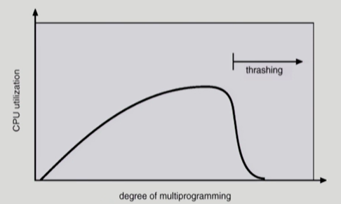 일반적으로 프로그램을 많이 할당하면 CPU 사용률이 올라가게 된다. 그런데 어느 한계에 다다르면, CPU 사용률이 떨어지게 되는데 이를 Thrashing 이라고 한다.