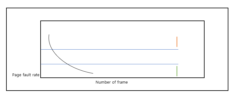 page default에 상한과 하한을 둬서 주황색 부분처럼 상한을 넘으면 프로세스에 frame을 더 할당하고, 하한값 이하이면