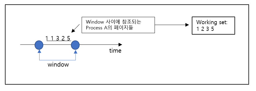 프로세스 A가 window 시간동안 1 1 3 2 5의 페이지를 참조했다고 하면, working set은 1 2 3 5가 된다. working set에 포함된 페이지는 물리메모리에 할당하고, 나머지는 버려버린다. 이 알고리즘은 참조된 이후 window시간 동안만 page를 메모리에 유지한 후 버리는 것과 같다.