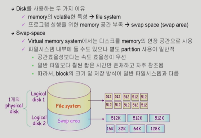 프로세스를 많이 사용하는 경우가 많아, 메모리가 부족하다. 이를 해결하기 위해 디스크의 Swap-space를 사용하게 되었다. Swap-space는 memory의 연장 공간이다.