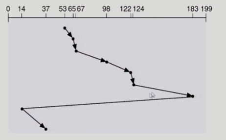 disk arm이 디스크의 한쪽 끝에서 다른쪽 끝으로 이동하며 가는 길목에 있는 모든 요청을 처리한다. (엘리베이터 알고리즘)