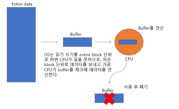 데이터를 한 곳에서 다른 곳으로 전송할 동안 일시적으로 데이터를 보관하는 메모리 영역. 예를들어 CPU는 1초에 100개의 데이터를 처리할 수 있지만 정작 처리할 데이터를 가지고 있는 보조 기억 장치는 데이터를 1초에 세 개밖에 보내주지 않는다. CPU입장에서는 아무리 일을 열심히 하고 싶어도 데이터를 보내주지 않기 때문에 능력에 비해 97 개 만큼 효율성을 잃게 된다. 따라서 entire block 단위로 읽기 쓰기를 하지 않고, 작은 block 단위로 buffer에 데이터를 모아두고, CPU는 다른 일을 하다가 돌아와서 buffer의 데이터를 연산한다. 이를 위해 임시 저장소인 buffer가 있는 것이다.