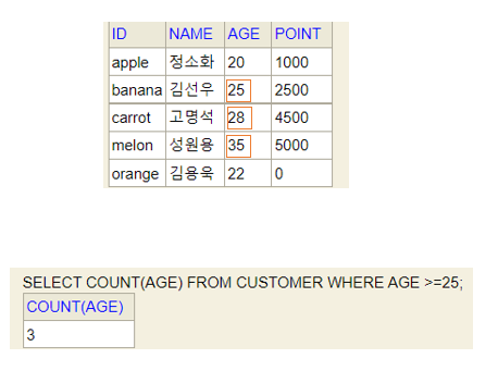 | COUNT | 속성 값의 개수 | 모든 데이터 |