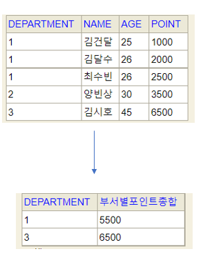 SELECT DEPARTMENT, SUM(POINT) AS 부서별포인트총합