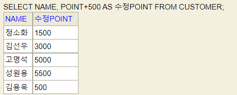 SELECT NAME, POINT+500 AS 수정POINT FROM CUSTOMER