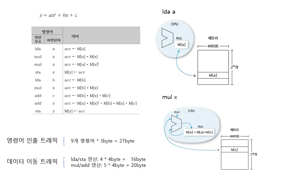 데이터 전송: mul/ add 명령어당 (2개 (피연산자 4byte씩) + 1개(결과 데이터 저장)) = 3 * 4 byte이고 mul, add가 총 5개이므로 12 * 5 = 60byte