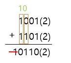4비트로 표현할 수 있는 정수는 -8 ~ 7입니다. 그렇다면 -7 - 3 = -10 과같이 오버플로우가 발생하는 경우는 어떻게 되는지 알아보겠습니다. 결과로 10110(2)이 나오지만 비트 수를 넘어가는 것을 제외하면 0110(2)입니다.